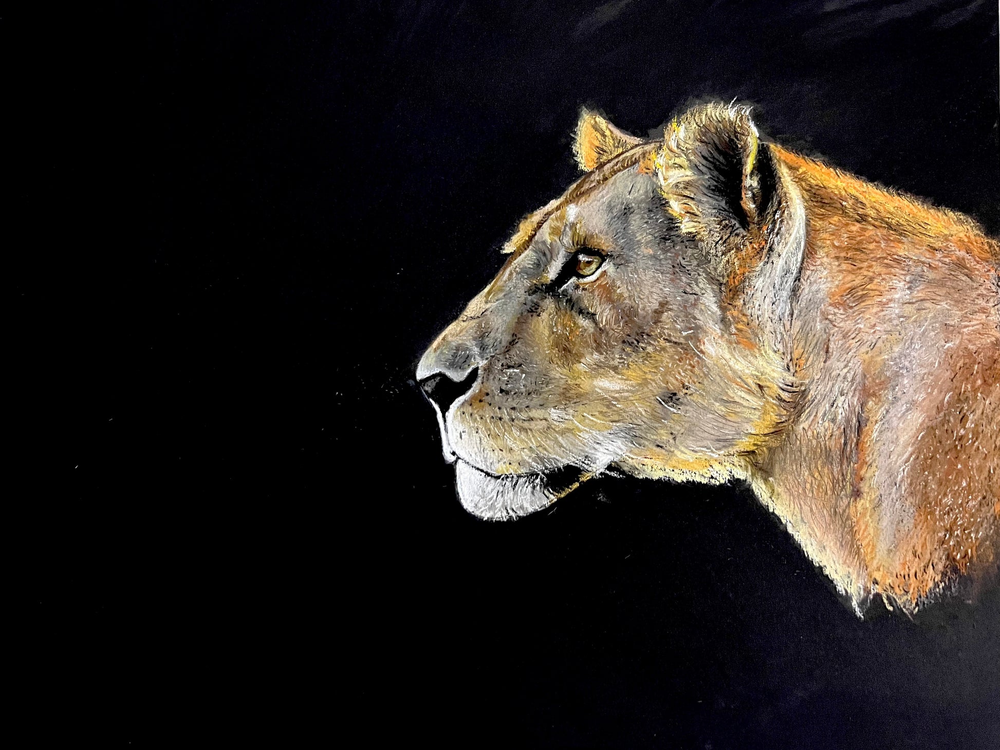 Cada trazo ha sido trabajado con precisión y sensibilidad, cuidando hasta el mínimo detalle, desde las texturas del pelaje hasta las luces y sombras que aportan profundidad y realismo. El uso del papel negro permite que los colores y los blancos destaquen con intensidad, dando como resultado una obra elegante, potente y llena de carácter.