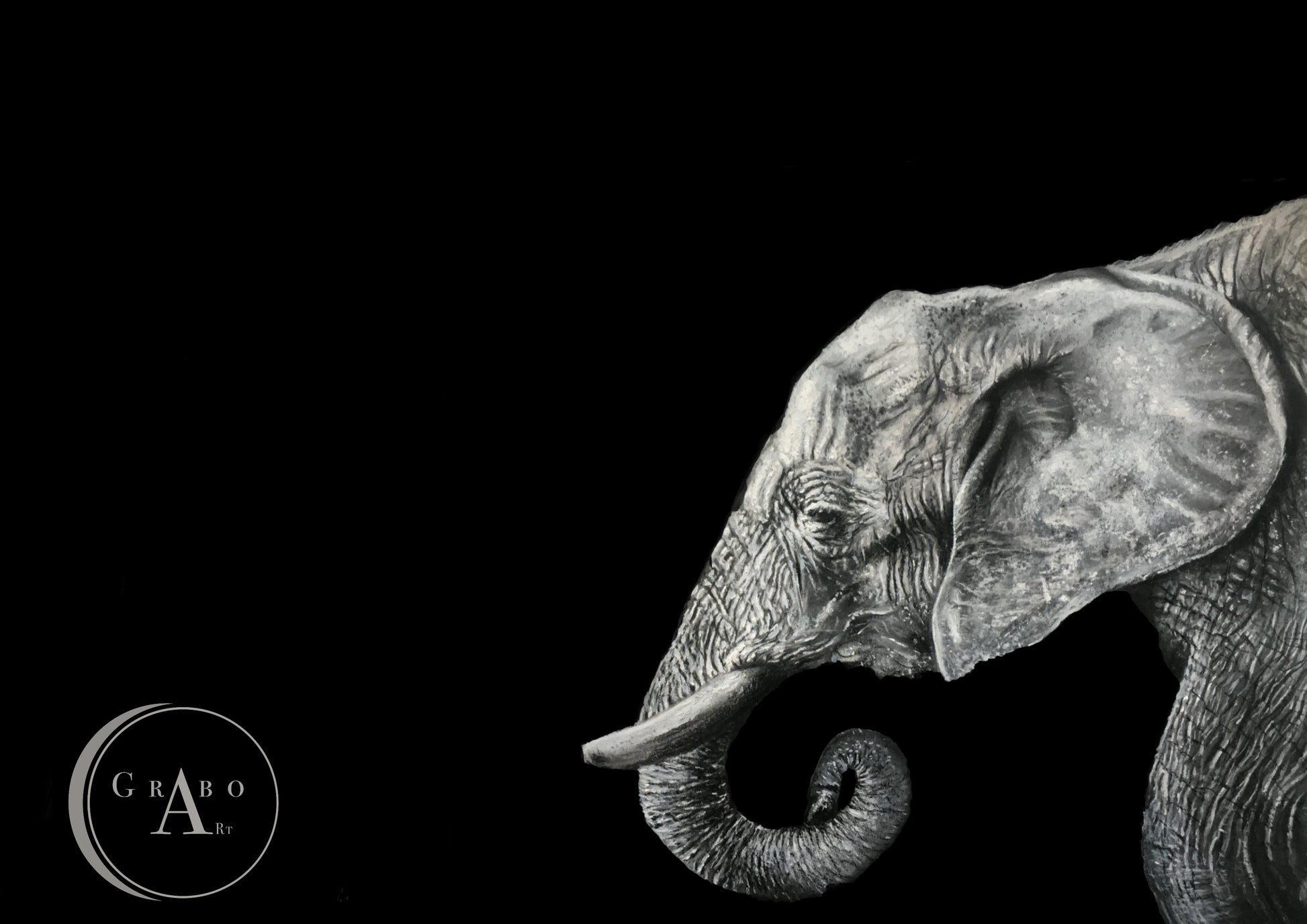 El detalle minucioso de cada arruga, la textura de la piel y la curvatura de la trompa emergen desde un fondo oscuro que resalta su volumen y carácter.